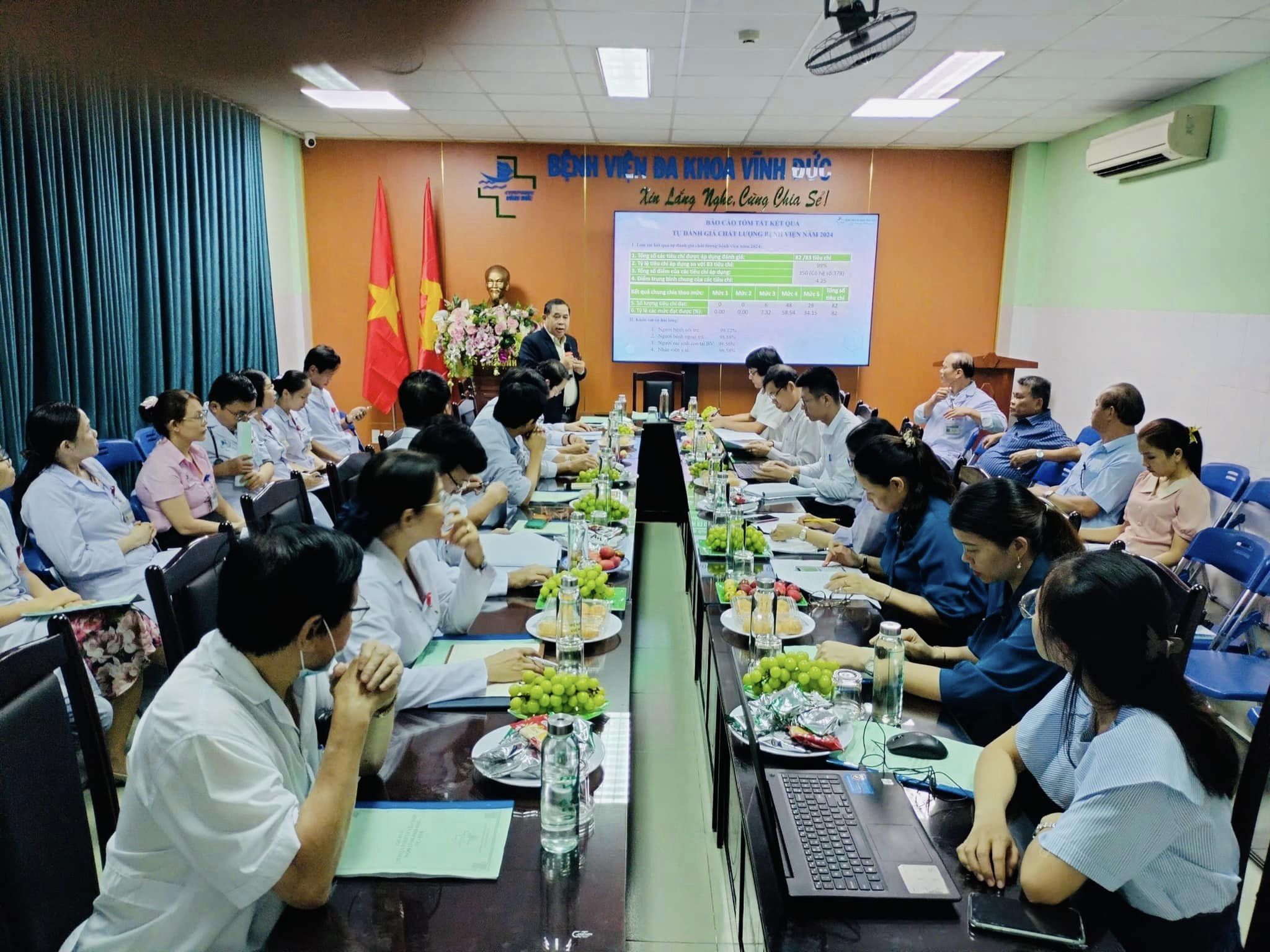 Ông Trương Quang Bình – Phó giám đốc Sở y tế nhận xét: “Kết quả kiểm tra cho thấy nhiều tiêu chí đã đã được hoàn thiện, nâng cao tính thực tiễn. Theo đánh giá của Sở Y tế, điểm chất lượng bệnh viện năm 2024 có nhiều cải tiến rõ rệt và đồng đều ở tất cả các khoa phòng. Tiêu chí chấm điểm này được Sở Y tế đánh giá dựa trên các hoạt động, công việc mà bệnh viện tuân thủ, thực hiện theo quy định và hướng dẫn của Bộ Y tế. Qua đó đã cho thấy sự chung sức, đồng lòng của tập thể cán bộ, y bác sỹ và nhân viên bệnh viện Vĩnh Đức đối với công tác cải tiến chất lượng.”