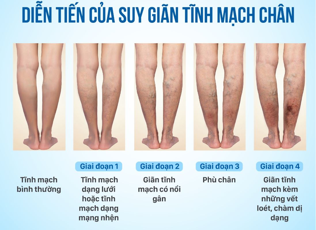 • Ngứa, da đổi màu (thâm, nâu) ở vùng cổ chân – dấu hiệu của giai đoạn nặng hơn.