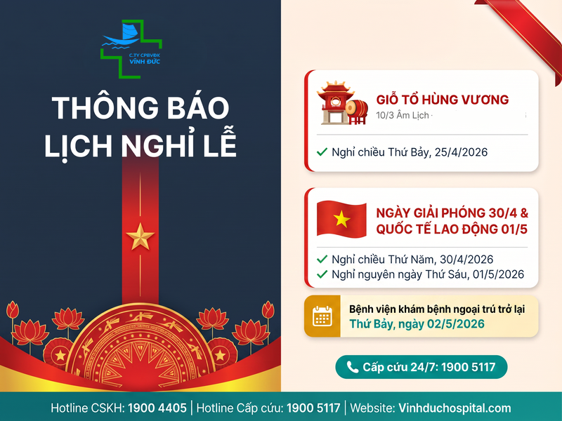 Bệnh viện Đa khoa Vĩnh Đức trân trọng thông báo đến Quý khách hàng và người bệnh lịch nghỉ lễ sắp tới như sau:
