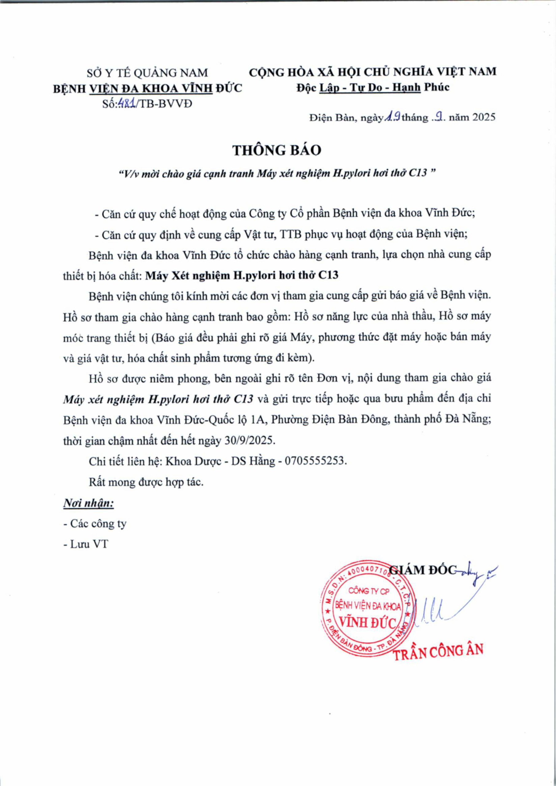 THÔNG TIN - THÔNG BÁOThông báo mời thầu số 481/TB-BVVĐ. V/v Mời chào giá cạnh tranh máy xét nghiệm H.pylori hơi thở C13 Posted on 20 Tháng Chín, 202520 Tháng Chín, 2025 by Nguyễn Thị Kim Huyền Sở Y tế tỉnh Quảng Nam thống nhất hồ sơ tự công bố cơ sở khám bệnh, chữa bệnh đáp ứng yêu cầu là cơ sở thực hành trong đào tạo khối ngành sức khỏe của Bệnh viện Đa khoa Vĩnh Đức